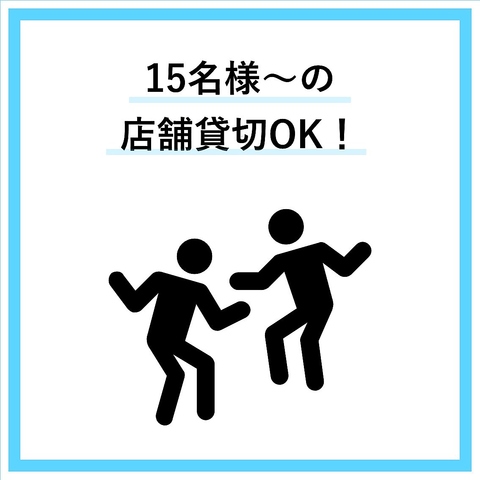 15名様以上でのご利用の場合は貸切もご利用いただけます。周りを気にすることなく、ワイワイとお過ごしいただけます♪人数・ご予算などお気軽にお店までお問い合わせください!ご連絡お待ちしております。