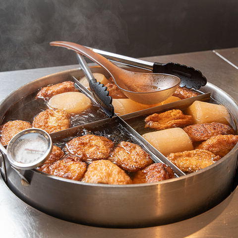 旨さの決め手は、大阪らしい特製のかつお出汁!上質な鰹の風味をしっかり効かせた深みのある味わいが、手作りのねりもんにじっくりと染み込んでいます◎優しく奥深い出汁の旨味が広がり、心と身体にじんわり染み渡る感覚です☆おでんならではの、ほっと落ち着く至福のひとときを満喫!一品料理やお造り、各種ドリンクと合わせるのもオススメ♪