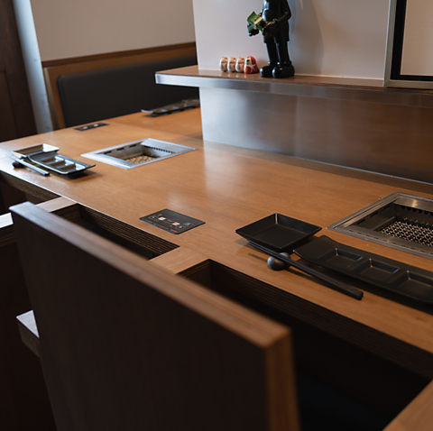 【カウンター席:1×4】お一人様でも気兼ねなくお食事を楽しめるカウンター席を4席ご用意しております。ふらっと立ち寄って、こだわりの焼肉と美味しいお酒を堪能したい時にぴったりです。美味しい焼肉を堪能しながら、自分だけの贅沢な時間を過ごすことができます。お一人様はもちろん、サク飲みにも最適です。