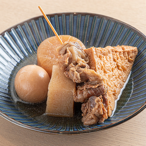 中央卸売市場の鰹節屋さんと試行錯誤を重ね、当店のために特別にブレンドした鰹節で取る出汁が自慢のおでんです。牛すじは黒毛和牛を使用し、こんにゃくはこんにゃく芋100%の手ごねのものを使用しております。じっくりと煮込まれた具材からにじみ出る旨味が、奥深い出汁と一体となった逸品です。ぜひご賞味ください。