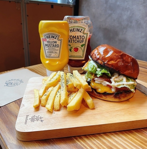ハンバーガーに使用しているバンズは長房団地にある『和気』さんから特注で作っていただいております。ほんのり甘みのあるバンズと牛100%使用しているパティとの相性が抜群です!男性の方からはもちろん。女性の方からも大人気のメニューです。