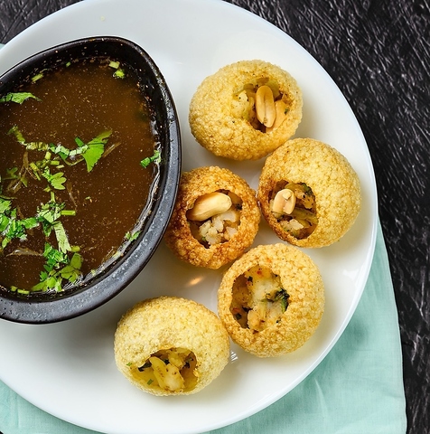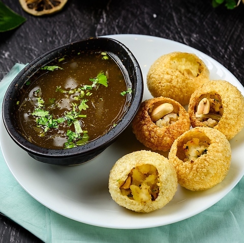 現地ネパールでも人気のパニプリ。カリッとした殻にスパイス水を注ぎ入れると、爽やかな酸味と香り豊かなスパイスがロいっぱいに広がります。おやつ感覚でも楽しめる一品です。