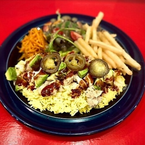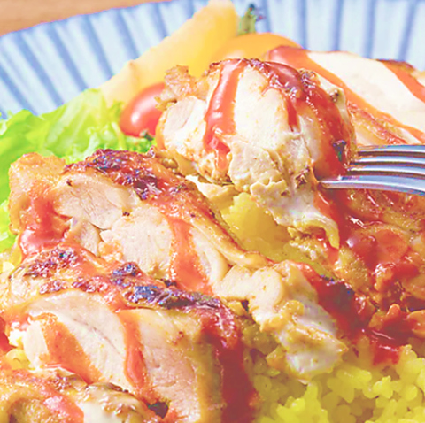 ニューヨークのソウルフード「チキンオーバーライス」。ターメリックで炊き上げた鮮やかな黄色のご飯の上に、こんがりと焼き上げたジューシーなチキンがごろごろ。さらに、特製ソースをたっぷりとかけて仕上げました。見た目の豪快さとは裏腹に、一口食べれば誰もが納得する、絶妙なバランスが魅力です。