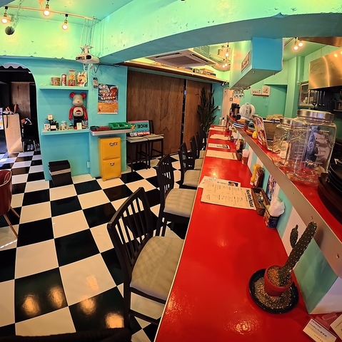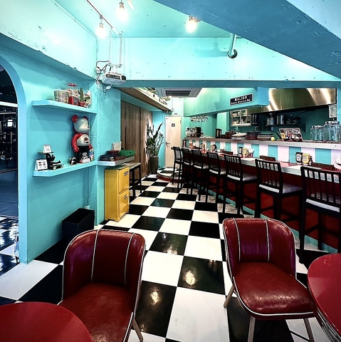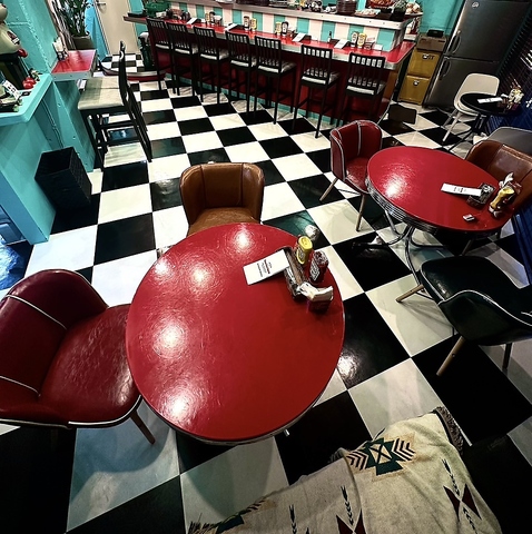古き良きアメリカのオールディーズな雰囲気が漂う、おしゃれな店内で皆様をお迎えします。お一人様でも気軽に立ち寄れるカウンター席から、仲間とのご宴会やご家族でのお食事にぴったりのテーブル席まで、幅広いシーンにご利用いただけます。本場アメリカの味と、心躍るようなレトロな空間で、思い出に残る時間をお過ごし下さい☆