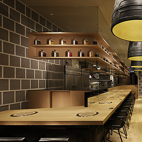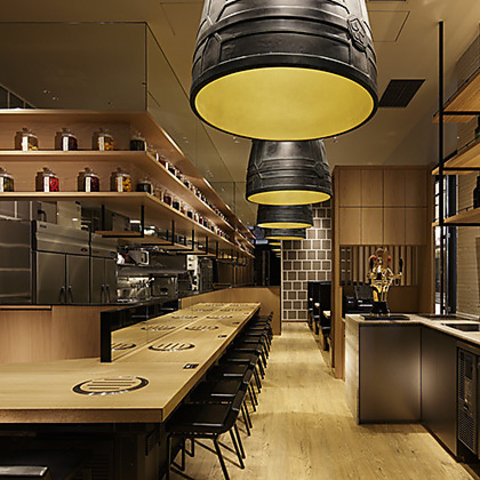 温かみのある木材とスタイリッシュな金属のコントラストが美しい内装。落ち着いた色合いが心地よい空間を作り出し、リラックスしながらお食事を楽しむことができます。