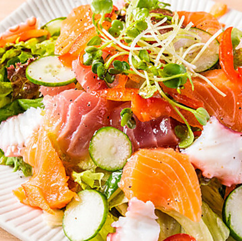 まぐろ、サーモン、しめ鯖の三種を贅沢に盛り合わせた、彩り豊かな一皿をご提供しております♪新鮮な魚介は、口に入れた瞬間に上質な脂の旨味がとろけ出し、噛むほどに甘みを感じられます。旬の鮮魚を厳選しているため、その日一番美味しい刺身をお楽しみいただけますよ!
