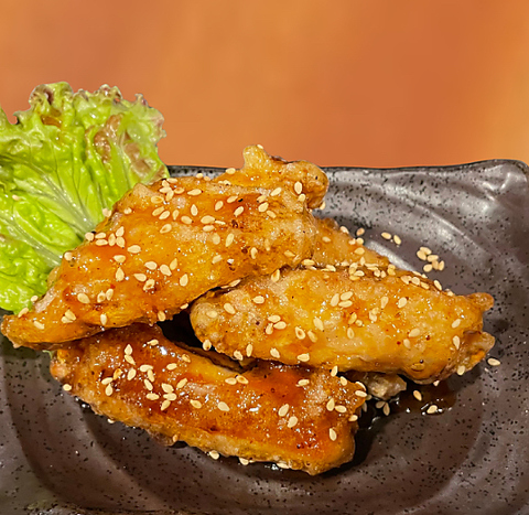 カリッと揚げた手羽中に、甘酸っぱい特製ダレがじゅわっと絡む!やみつきの一品。