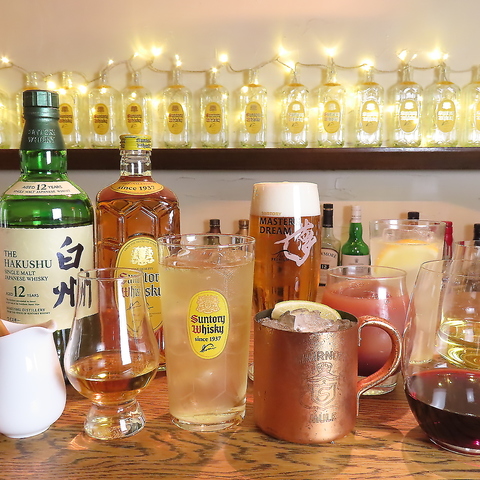 ビールやサワーはもちろん、特にウイスキーの品揃えにはこだわりがあります。ジャパニーズウイスキーの「響」「白州」「山崎」をはじめ、スコッチやバーボンなど全20種類以上の厳選された銘柄を取り揃えております。オーダーに合わせて作るカクテルや、120分の単品飲み放題(3500円)もご用意!