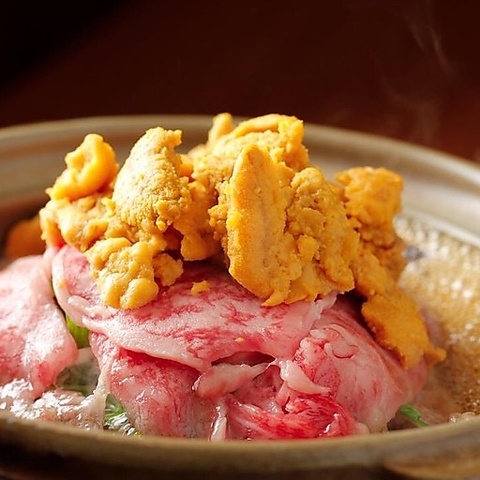 雲丹と和牛のすき焼きを、さらに雲丹と卵黄のつけだれで食べる贅沢な逸品。残ったスープでチーズリゾットをつくることができます。(1人前550円(税込))