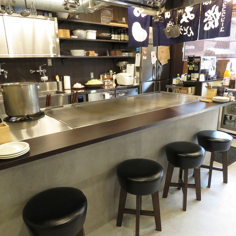 【和の趣を感じるカウンター席】お一人様でも気兼ねなくご利用いただけるカウンター席を4席ご用意しております。目の前で焼きあがるお好み焼きや鉄板焼きの香ばしい音や香りを楽しみながら、店主との会話もお楽しみいただけます。お仕事帰りの一杯や、ふらっと立ち寄りたいときにも最適です。