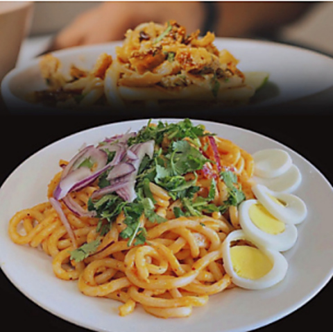 自家製チキン&玉ねぎソースにひよこ豆粉を加え、 うどん麺とパクチーで仕上げました。旨みと香りが広がる、汁なしエスニック麺です。※パクチー抜きも対応できます。お気軽にお申し付けください。
