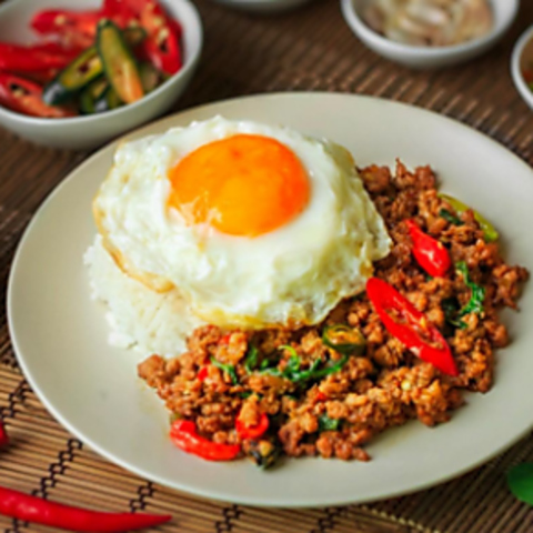 豚ひき肉とバジルを炒めたタイの定番ご飯。(辛さ調整できます)
