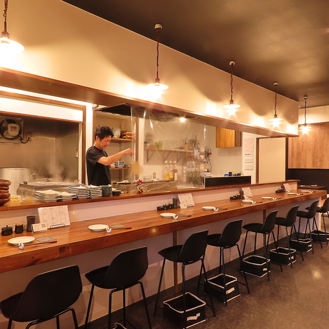 【カウンター席】調理風景を間近で見られる臨場感あふれるカウンター席がございます♪お一人様でのご来店はもちろん、カップルでのデートにもおすすめです。職人が備長炭で焼き上げる焼鳥の香ばしい匂いや、愉快なスタッフとの会話も楽しめる、特等席です◎