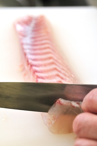 お気づきでしょうか?新鮮な鯛は、切り身の向こうに包丁の刃が見えます!