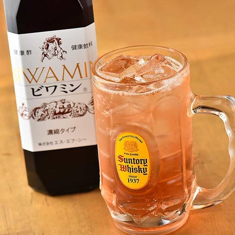 ビワのエキス入りぶどう酢・ビワミンを使った特製ハイボール。シュワッと強い炭酸で飲み口も軽やか。