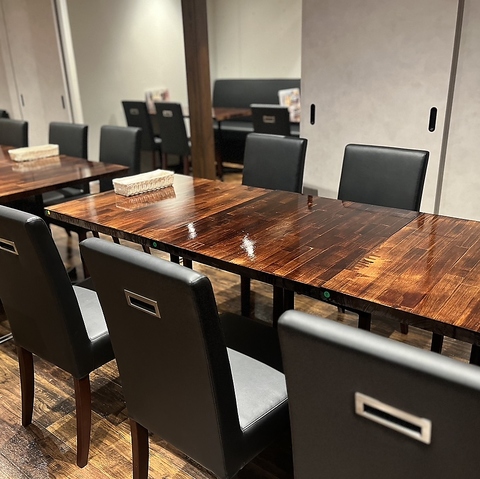 【テーブル席】4名様席を自由に組み合わせて、多様な人数に対応できます。会社の同僚との飲み会や中規模の宴会など、様々なシーンにご利用ください。美味しい料理と会話で盛り上がること間違いなしです!