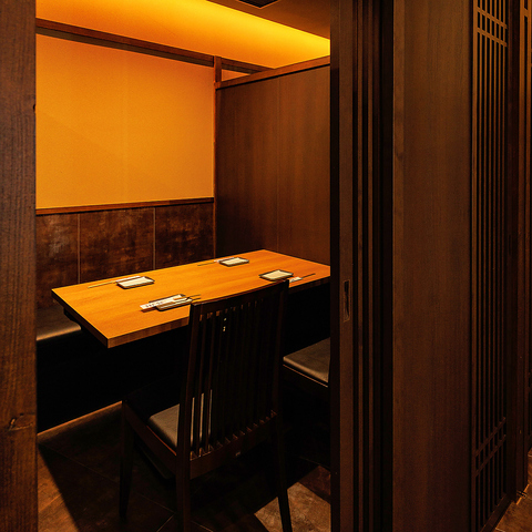 ≪プライベート空間で特別な時間を≫ 落ち着いた空間が広がる個室は、プライバシーを大切にしたい方に最適です。大切な方とのデートや接待に、特別な時間を過ごすための最適な環境をご提供いたします。厳選された旬の料理とともに、心ゆくまでご堪能ください。