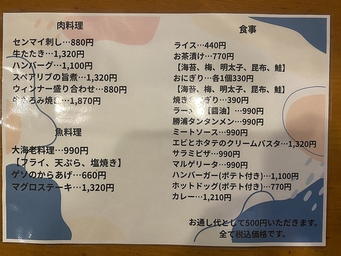 | お酒 | カクテル充実、焼酎充実、日本酒充実、ワイン充実 |
