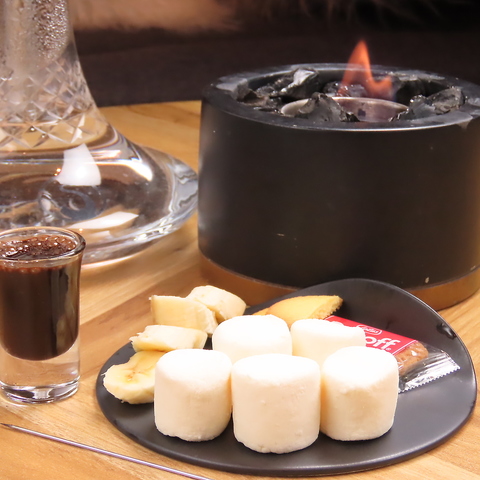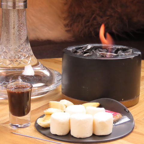 ミニ暖炉で焼く!『焼きマシュマロセット』。シーシャを楽しみながら、火のゆらぎを眺めつつ、ほんのり焦げたマシュマロから甘い香りが立ち広がります。ゆったりとマシュマロを焼く優雅なひとときをお過ごしください。外はカリッと、中はとろける甘さがたまりません!シーシャのお供にどうぞ♪