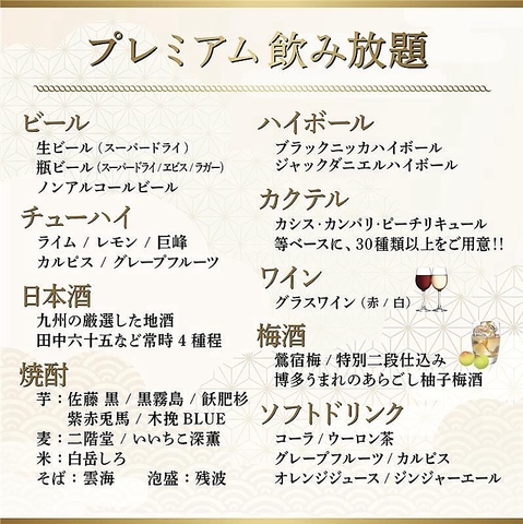 通常プランの内容に加え、銘柄焼酎(赤兎馬、佐藤の黒、いいちこ真薫など)銘柄日本酒(田中六五や九州の厳選した地酒)30種以上のカクテル、ノンアルコールビールなど、ワンランク上のドリンクを楽しめる贅沢な内容です。接待のご利用や日本酒好きの方におすすめです。