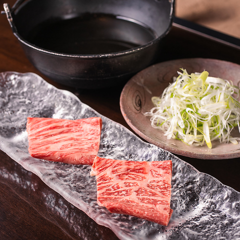 和牛の彩り前菜に始まり、厚切りトロタンを含む塩焼きとタレ焼き、旬野菜とともに味わう特選サーロインのすき焼きは、山芋とろろと玉子でまろやかに。ご飯物とデザートまで揃えた全7品の贅沢コース。プライベート利用や会食はもちろん、別な日のお食事にも最適です。詳細はコースページでご確認ください。※写真は一例です