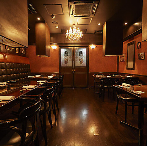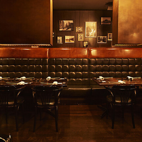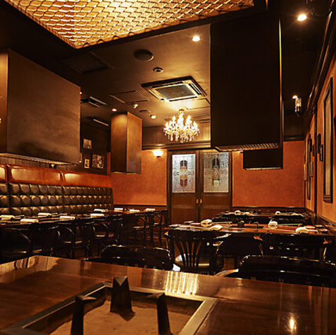 【テーブル席】シャンデリアに照らされたシックな空間には、重圧感のあるソファーや落ち着いた雰囲気のテーブル席をご用意しております。テーブル席では、最大10名様までひとつのスペースでご一緒にお食事をお楽しみいただけます。
