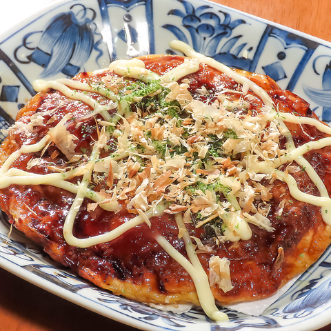 鉄板で焼き上げることで、外はカリッと、中はしっとりとした食感に仕上がります。たっぷりのソース、マヨネーズ、青のり、かつお節をトッピングして、目でも楽しめる一皿です。家族や友人と一緒に焼きながら楽しむスタイルは、食卓を囲む幸せなひとときを演出します。