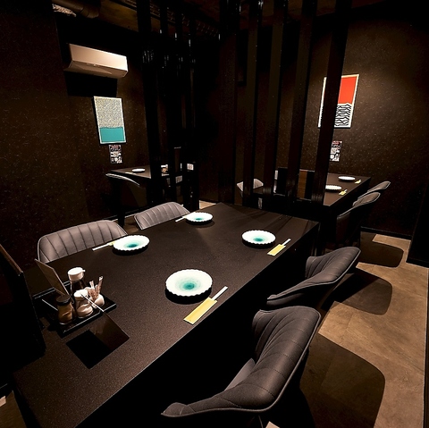 黒を基調とした4名席は、落ち着いた重厚感が漂う上質な空間。ほどよい距離感とプライベート感で、大切な仲間との食事をゆったりとお楽しみいただけます。