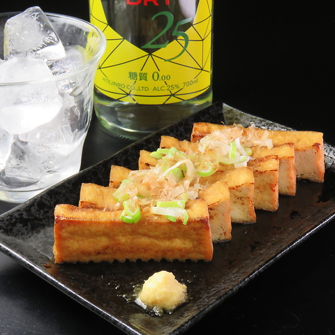 ジュワッと熱々の厚揚げに、香ばしいえび醤油の風味をまとわせて、カリっと焼き上げた当店自慢の逸品です★外はカリッと、中はフワッとろけるような食感もたまらないポイント。熱々のうちに、お召し上がりください♪ 300円(税込)