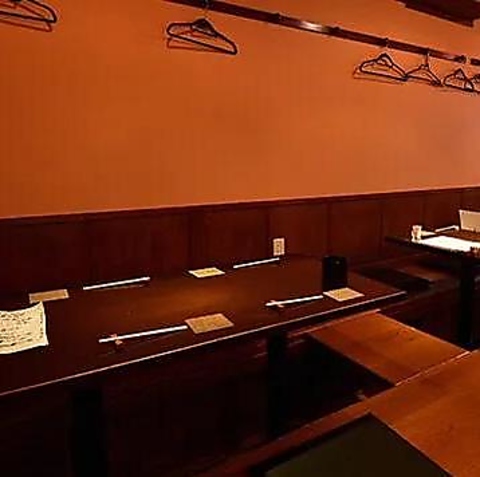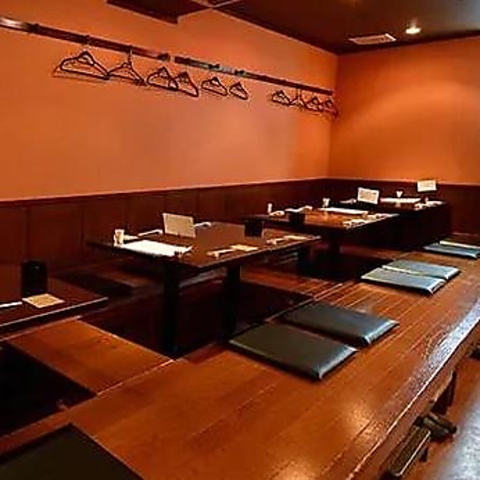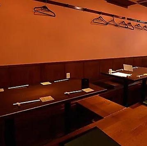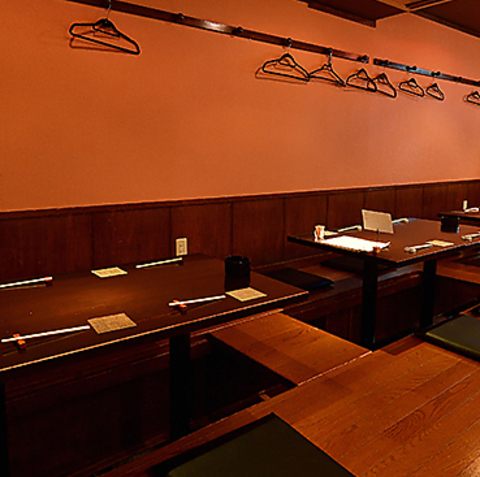 【掘り炬燵席完備】足を伸ばしてゆったりと寛げる、掘りごたつ式のお座敷席もご用意しています。和の趣と木の温もりが感じられる店内は、友人や家族でのお食事などプライベートな集まりにもオススメです。