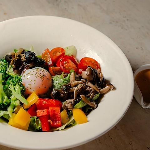 2種のレタス、ベーコン、しめじ、パプリカ、温泉卵、ミニトマト、オリーブ