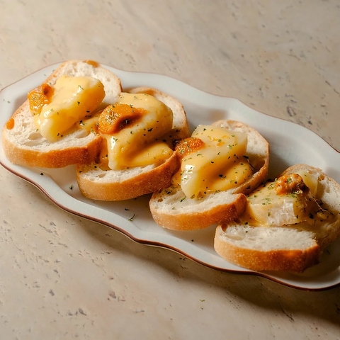 濃厚なウニととろけるカマンベールチーズが絶妙に溶け合うブルスケッタは、まさに至福の逸品◎香ばしく焼き上げたバゲットの上にウニとカマンベールチーズが盛り付けられ、一口食べればその豊かな風味に魅了されます。ワインやスパークリングワインと共に、前菜としてお楽しみください♪
