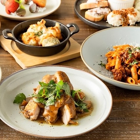お肉もパスタも前菜も楽しめる本格イタリアン。さらにカフェメニューまで楽しめる贅沢なラインナップ。もちもち生パスタ、焼きたて手づくりピザ、季節のアヒージョなど、ひと皿ごとに丁寧に仕込んだ王道メニューがずらり。イタリアンの安心感にカフェのときめきを重ねた、ちょっと特別な時間をお届けします。
