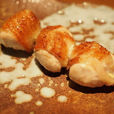 育から徹底的にこだわった比内地鶏を提供しています。秋田県比内地鶏は、日本三大地鶏の一種で、一番手間のかかる「放し飼い」を実践し、160日~180日間、モーツァルトを聴かせながら育てています。この独自の飼育方法により、赤身が強く濃厚な肉質が生まれます。寒冷地育ちのため、皮は厚くコラーゲンも豊富で、ジューシーな味わいが特徴です。