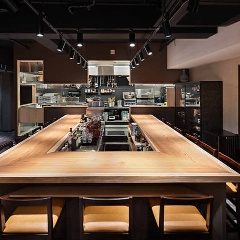店内のカウンター席には、厚さ6cmもの大杉から切り出した一枚板を贅沢に使用しています。高さは90cmと少し低めに設定されており、オープンキッチン越しにスタッフとの会話も自然と弾む絶妙な距離感です♪温かみのある木の質感に包まれながら、肩肘張らずにゆったりとした時間をお過ごしいただけます。お一人様やデートでのご利用にも最適です。