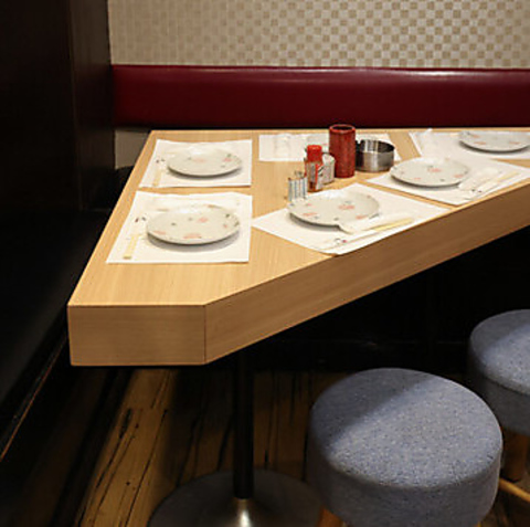 木目を基調とした落ち着いた雰囲気のテーブル席は、詰めていただければ最大6名様までご利用可能です。ご友人同士や会社でのご宴会、ご家族連れでのお食事など、幅広いシーンでご利用いただけます。ゆったりと座れるため、賑やかな飲み会から、じっくり語り合いたい時まで最適です。