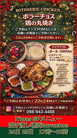 【予約受付中】ボラーチョス沖縄のクリスマス限定「鶏の丸焼き&タコスプレート」!鶏の丸焼き1羽に2種のトルティーヤ、豊富なトッピング付で、家族や友人と自由に巻いて楽しめます。受取は12月24・25日の17~22時に店頭にて。12月22日24時締切、ご予約はインスタDM・電話・店頭で受付中です!