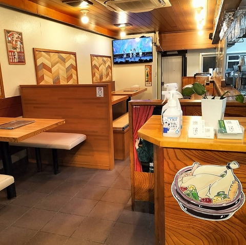 木の温もりを感じるテーブル席が並び、落ち着いた雰囲気の店内。広すぎず程よい距離感で、グループでも一人でも居心地よく過ごせます。心地よい空間でゆったりと食事を楽しめます。
