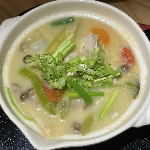 青唐辛子の鮮やかな辛みと、ココナッツミルクのまろやかさが絶妙に絡み合うタイ料理の定番カレー。香り豊かなハーブやスパイスを加え、深みのある味わいに仕上げています。ご飯との相性も抜群で、一度食べるとクセになる辛さとコクを楽しめる一皿です。