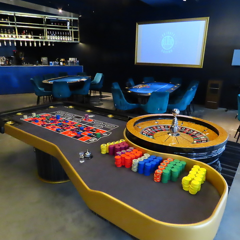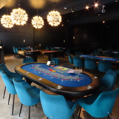 日常に刺激と興奮を!店内には青のカジノテーブルやカードシュー、チップなど本格的なカジノ設備が並び、まるでラスベガスのカジノのような雰囲気を再現しています。ポーカーテーブルやルーレット台など専門のゲーム台を完備し、本場の空気感を日本にいながら体感できる贅沢な空間です!