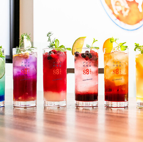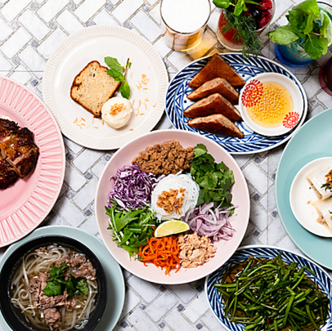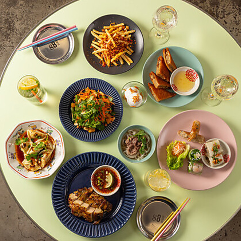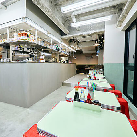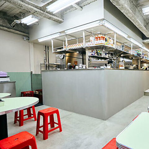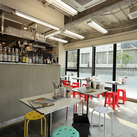 ガラス張りの外観が印象的な当店。手前のフロアは、アジアの街角屋台を模したモダンな空間で、昼は窓からの自然光、夜はネオンライトが照らす異国情緒溢れる空間です♪ミントグリーンのテーブルと赤い椅子は写真映えもばっちりです◎