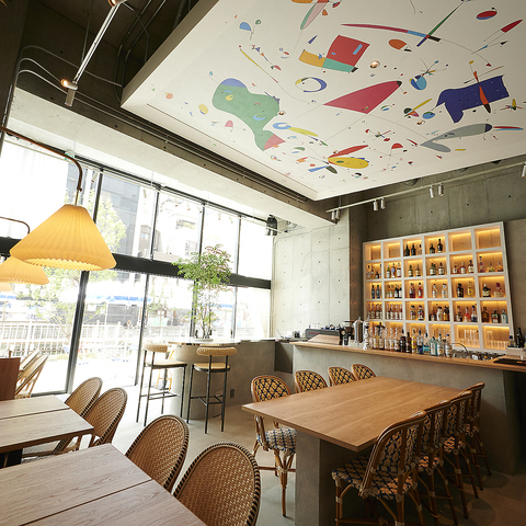 暗めの間接照明がお洒落で、観葉植物の緑が居心地の良さをプラス。そんなシックで落ち着いた雰囲気のもと、食事の時間を満喫いただけます。統一されたこだわりのインテリアと、天井で目を引くインパクトがある「渋田薫」さんのアート作品もお楽しみポイントの一つです。
