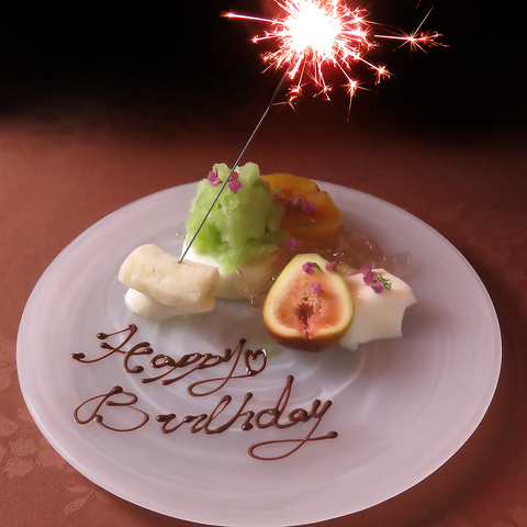 お誕生日の方には、特別な日をさらに華やかに演出するため、コースのデザートメニューを『記念日プレート』にご変更いただけます。大切な方のお祝いにぴったりな、心温まるデザートをご用意し、特別なひとときをお届けいたします。ぜひ、ご予約の際にお知らせください!喜びあふれるお祝いを一緒に創りましょう♪