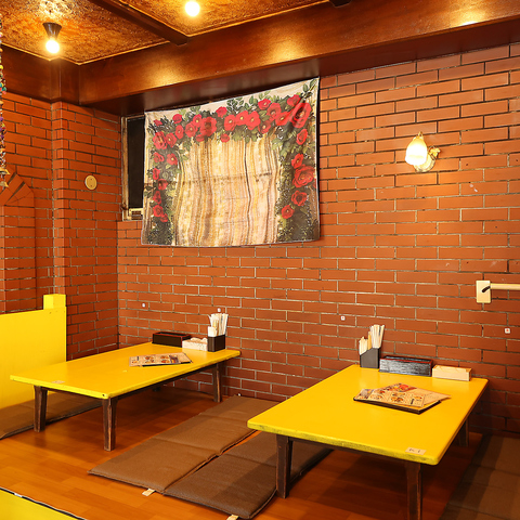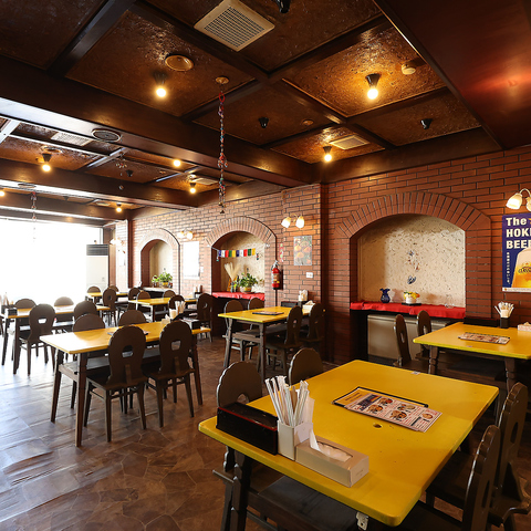 異国情緒が感じられる内観は、落ち着いたアットホームな印象。レンガ調の壁が、まるで異国の地にいるような気分に。広々とした店内には、4名×13卓のテーブル席と、4名×2卓のお座敷席が用意されており、どちらの席でも快適にお過ごしいただけます。複数卓を利用して、大人数での集まりも可能です!