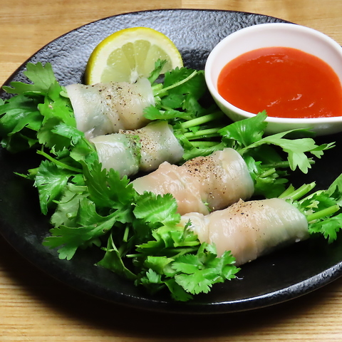 香ばしく炙った薄切り鶏肉を、たっぷりのパクチーと一緒に包み込むように味わう贅沢な一皿。噛むほどにあふれる鶏の旨みと、パクチー特有の爽やかな香りが口いっぱいに広がります。レモンをひと搾りすれば、さらに軽やかな後味に。パクチー好きにはたまらない逸品です。