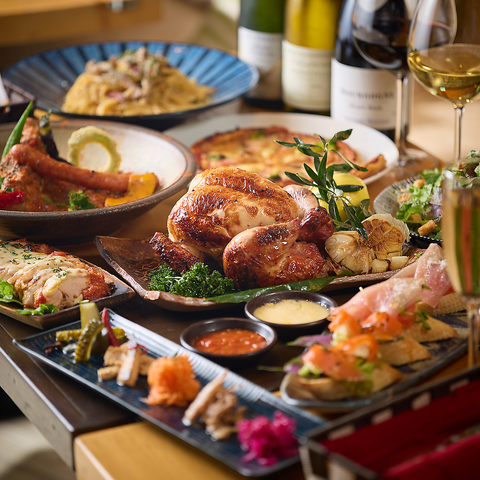 おすすめメニューは店内の黒板から!パスタやハンバーグにステーキなど、豊富にメニューをご用意。生ビールも含む豪華飲み放題プランや、ナチュラルワインに自家製ドリンクなど、料理との相性バツグンのお飲み物も充実◎