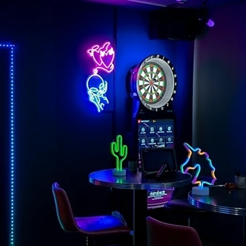 【テーブル席】ゆったりとしたプライベート空間で、心ゆくまで友人との会話や楽しいアクティビティを楽しめます。最大20名様までご利用いただける広々としたスペースで、フロア貸切も可能です。ネオンのライトが幻想的な雰囲気を醸し出し、ダーツを楽しむだけでなく、特別な思い出を作るための理想的な場所となっています。