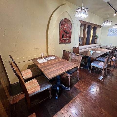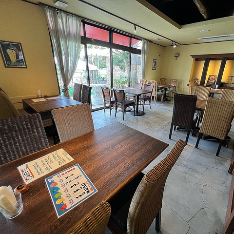 【ゆったりと食事を楽しめるテーブル席】温かみのあるインテリアと開放的な窓からの自然光が心地よい空間を演出しています。テーブルは木の温もりを感じるデザインで、ゆったりとした椅子が配置されており、リラックスした時間をお楽しみいただけます♪