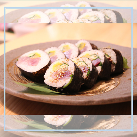 ~自慢の一品~《明神自慢のオリジナル手巻き寿司「明神巻」》新鮮な海鮮を贅沢に使用し、シャキッとした胡瓜、コリコリ食感のたくあんがアクセント。香ばしいごまをふりかけ、仕上げにごま油をひと垂らし。口に入れた瞬間、素材の旨みと香りが広がる、まさに五感で楽しむ逸品です。