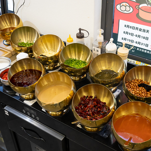 火鍋にぴったりの多彩な薬味を取り揃えています。香り高いネギや唐辛子などのスパイス、特製のタレまで、選ぶ楽しさが広がります。お好みの薬味を加えることで、味のバリエーションが増し、より一層美味しさを引き立てます。自分だけのオリジナルな味を楽しんで、心ゆくまで火鍋を堪能してください◎